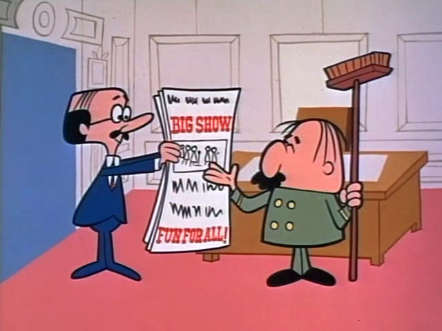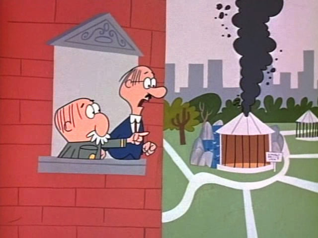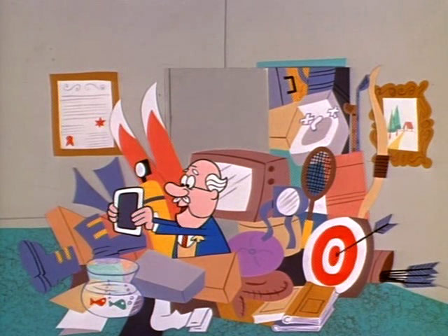 Not to be discouraged, Tennessee and Chumley made a habit of then visiting the office of their good friend Phineas J. Whoopee, the “man with all the answers” to get some expert advice. Mr. Whoopee knew a good deal about everything and was always happy to explain the scientific principles underlying how things worked. To help illustrate his points he used a ‘three-dimensional black board’ (or 3DBB, as he called it) that he stored in a closet. Each time he opened the closet door he was buried in an avalanche of miscellaneous items, from which he triumphantly emerged with the device. The 3DBB had the ability to render what was drawn on it into three-dimensional reality. This made the lessons he was ostensibly teaching Tennessee and Chumley entertaining to the kids watching at home, and informative as well. With the assistance of their newfound knowledge, Tennessee and Chumley set off and generally succeeded in carrying out whatever task they had begun, but rarely without unforeseen, negative repercussions.