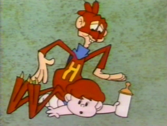 The leader of the team was Diaper Man, who was either an infant with the voice of a 50 year old chain smoker, or a man disguised as an infant. Diaper Man dressed in a diaper and cape and was armed with a baby bottle, which he used as an improvisational tool for all types of purposes. At times he also suckled the contents of the bottle to gain a bit of extra strength. The episodes didn’t dedicate any time to the civilian lives of the heroes, but the scene with the cartoon’s theme song (which was shown approximately one minute into every story) gave some indication of their professions by showing the heroes changing from their everyday occupations into their crime fighting alter egos. In his civilian identity, Diaper Man laid in a crib and sucked his thumb.